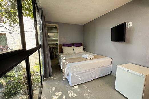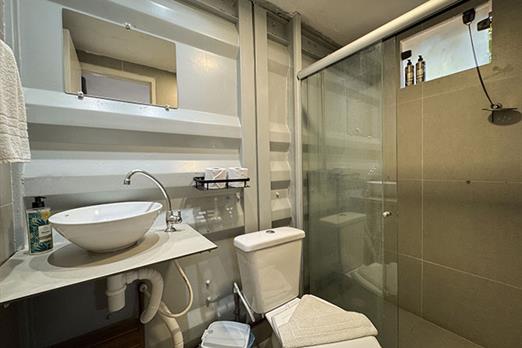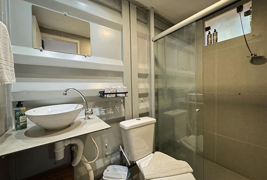 Quarto Ecobox (Container): Esse quarto é diferente e especial. Ele fica em um container, cercado pelo jardim, proporcionando aconchego. Mesm...