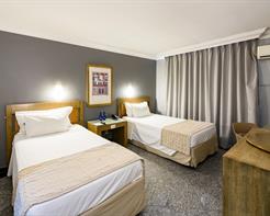 Máx.Quarto com duas camas de solteiro, cofre, fechadura eletrônica, piso frio, frigobar, ar-condicionado, banheiro privativo, varanda, TV a Cabo... (ver mais)