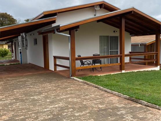 A varanda com mesa, cadeiras e estacionamento para o veiculo na porta do chalé. Decoração rústica.