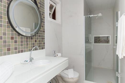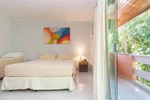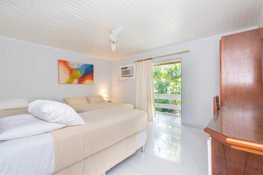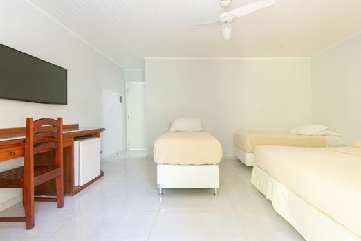 Suíte espaçosa é equipada com cama queen size e 2 camas de solteiro, ar condicionado, ventilador de teto, cofre, frigobar, tv LCD, telefone e sacad...