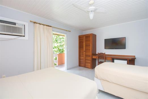 Suíte espaçosa é equipada com cama queen size e 2 camas de solteiro, ar condicionado, ventilador de teto, cofre, frigobar, tv LCD, telefone e sacada.