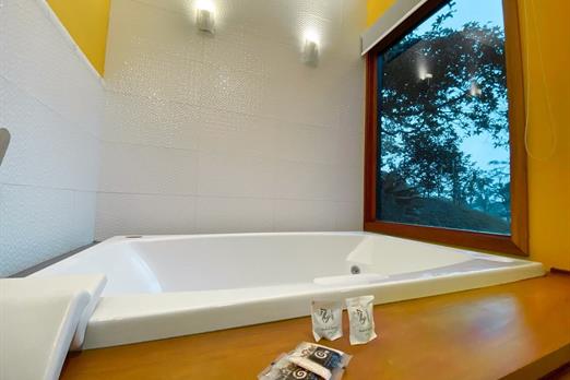 Os bangalôs possuem varandas. São equipados com cama queen size, travesseiros com tecnologia da Nasa, toalhas de fio egípcios, mini cozinha, lareira, ar condicionado, smart TV e banheira de hidromassagem.