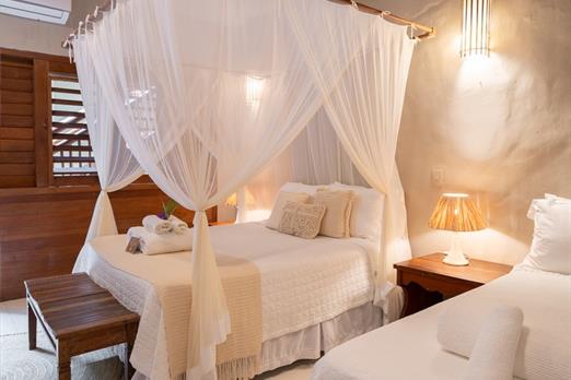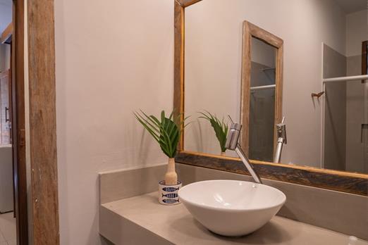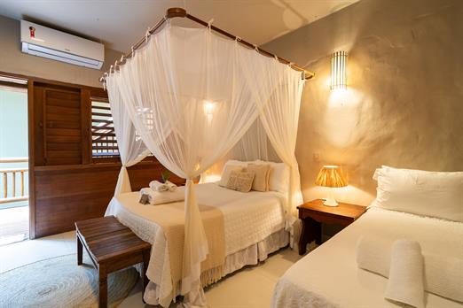 Todas as suítes são compostas por um dormitório com banheiro, frigobar, ar-condicionado, TV a cabo e armários e possui decoração e marcenaria 100% produzida com mão de obra de artesãos e artistas locais.