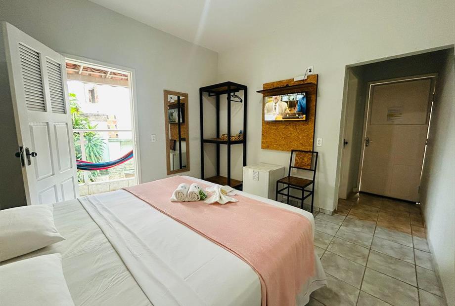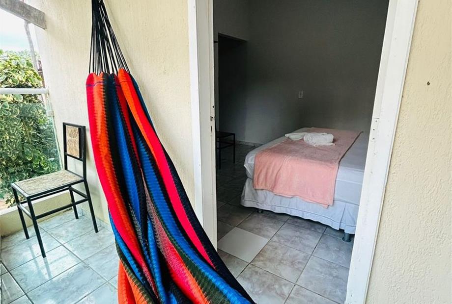 Acomodação ideal para casais ou solteiros que buscam conforto e praticidade durante a estadia, com café da manhã incluso e uma rede na varanda com vista para a rua tranquila, perfeita para relaxar após os passeios.