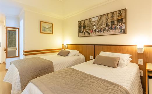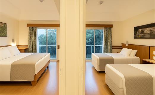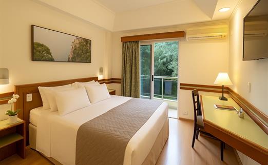 Cada apartamento é confortável, arejado e funcional, com vista para cidade com sacada e vidros anti ruído, acomoda 4 pessoas acomodadas em 2 apartamentos em uma cama de casal no 1° apartamento e em 2 camas de solteiro no 2° apartamento. Cada apartamento possui: banheiro privativo, secador de cabelo, wifi, frigobar, ar condicionado split, TV 42 polegadas a cabo, cofre, guarda-roupa, mesa de trabalho, piso de madeira / parquet, tomada perto da cama, telefone, espelho de corpo inteiro, cabideiro, blackout, abajur e detector de fumaça. Área do quarto: 20 m² cada um. Tamanho da cama: 1 cama de casal tamanho 2m x 1,60m e duas camas d...