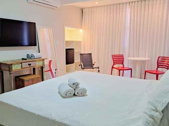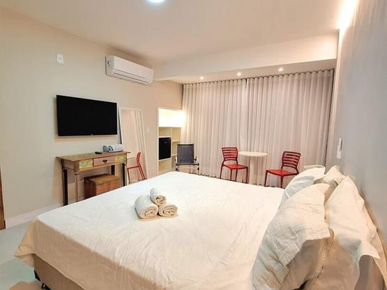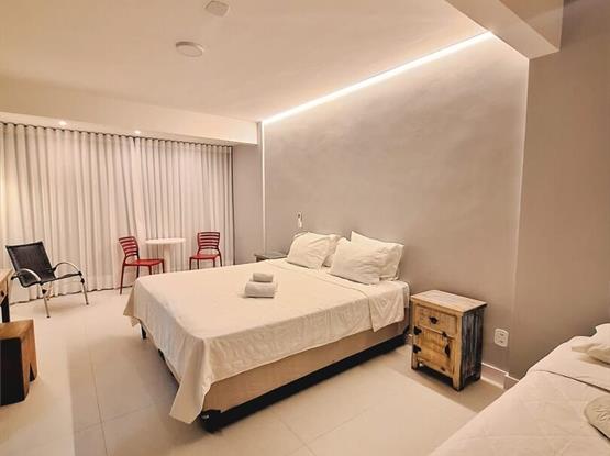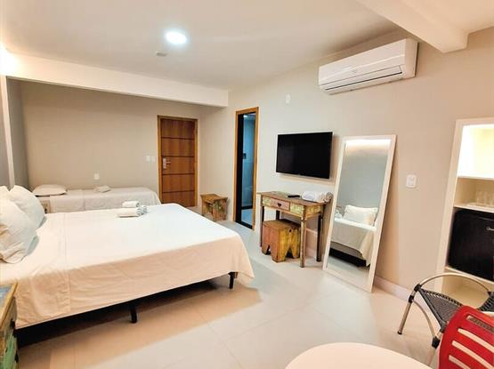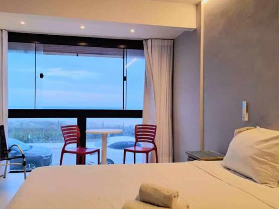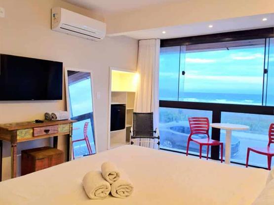 Quarto frente ao mar, oferece uma Vista Panorâmica da Praia do Foguete aonde você pode desfrutar de um amanhecer exclusivo, vendo o Sol sair do Mar desde a sua cama. Equipado com Cama Queen, podendo ser adicionadas até 2 Camas de Solteiro. Máximo de 4 hóspedes. Além de 1 criança cortesia de até 7 anos acomodada na cama dos pais. O quarto dispõe de Ar Condicionado, SmartTV, Frigobar, Cofre, Secador...