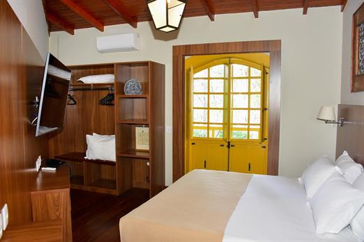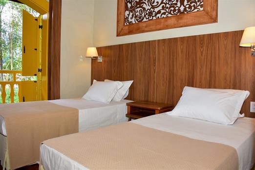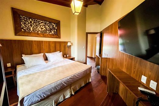 Essas acomodações são ideais para famílias grandes, pois comportam até 4 pessoas em dois quartos conjugados com um banheiro completo. O quarto 1 possui uma cama de casal padrão, enquanto o quarto 2 tem duas camas de solteiro. As suítes também estão equipadas com dois ar-condicionado tipo split e duas TVs de 32" com tela plana e controle remoto. O banheiro conta com box de vidro temperado.