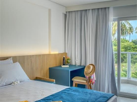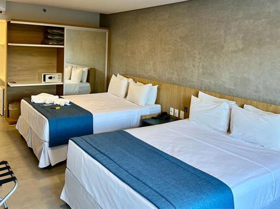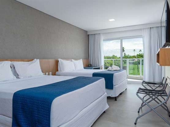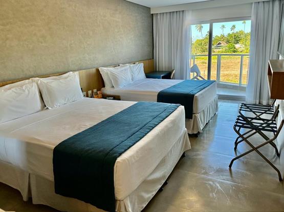 Atenção: Quarto voltado para obra, fica localizado no 1º andar, dispõe de 02 camas de casal , e não possui vista para o mar, a vista da varanda é para um terreno que fica ao lado do hotel que está em construção, depõe de varanda, ar condicionados, Frigobar, cofre, tv smart de 50 polegadas, wi-fi grátis, secador de cabelo e telefone. >> Nas diárias estão inclusos o café da manhã e jantar, as bebidas são cobradas a parte. Quartos para não fumantes
