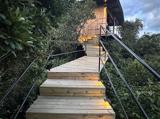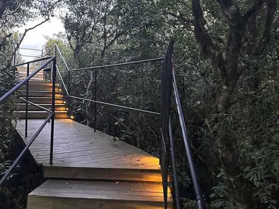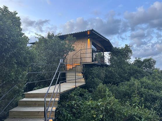 Chalé nas copas das árvores, Bauman está suspenso 14,5 m do chão.