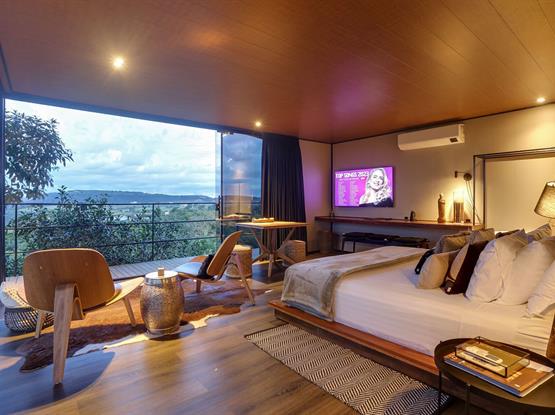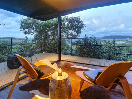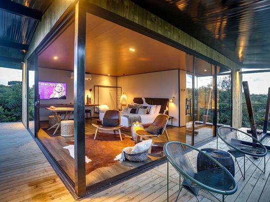 0 chalé é equipado com roupões, pantufas, chaleira elétrica, Nespresso, frigobar, secador de cabelo, amenities Loccitante, banheira de imersão, cama queen-size, poltrona shell, bancada de trabalho, mesa externa com cadeiras e deck com cadeira de balanço.