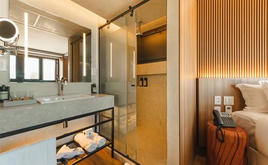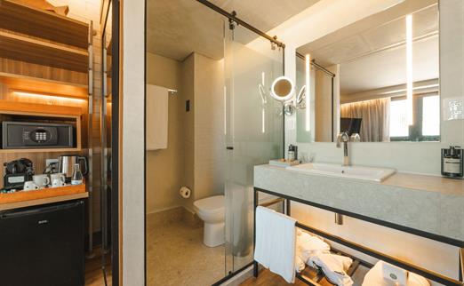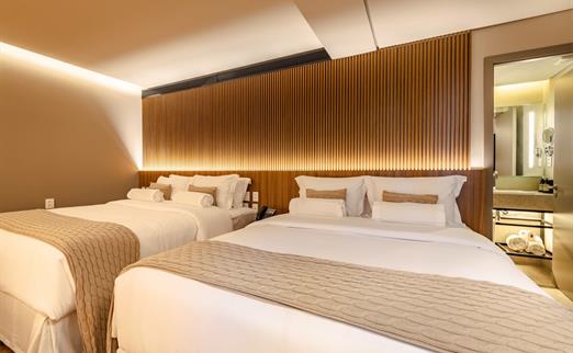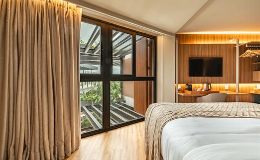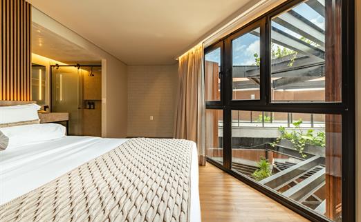 Vivencie a arquitetura singular do BA’RA no apartamento Tropical View e abra as janelas para o luminoso jardim suspenso do hotel e sua ponte, símbolo de sua identidade. Acomodando até 4 pessoas (adultos e crianças), desfrute do espaço amplo e todo o conforto das duas camas queen size. Experimente a excelência dos amenities de banho 100% veganos, enxoval Trousseau, Wi-Fi, TV Full HD com serviços de streaming, cafeteira, cápsulas de café São Braz, marca presente entre as seis maiores torrefações de café do País, variedade de chás fornecidos pela Tea Shop, maior e mais especializada rede de chás nacional, além de frigobar, cofre eletr...