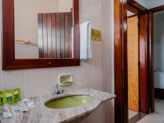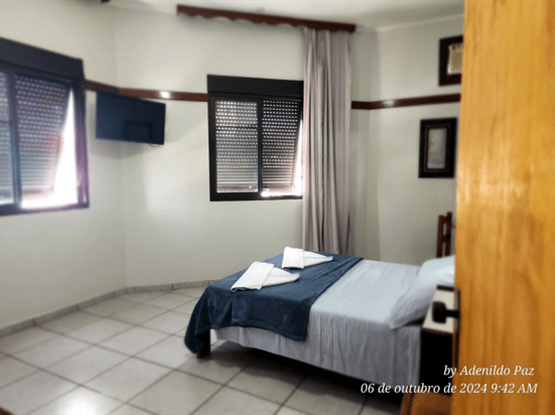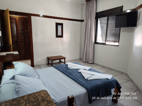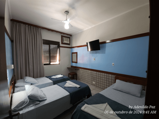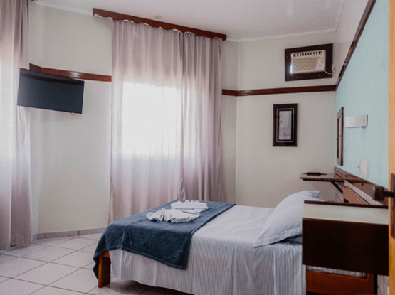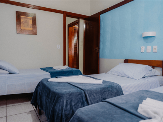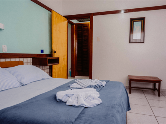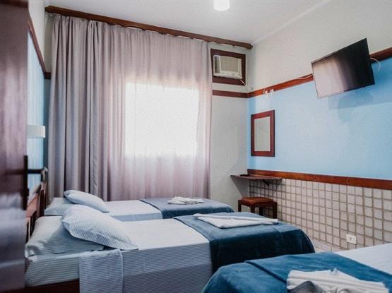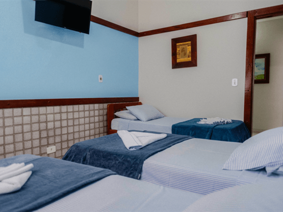 Apartamento quíntuplo familiar, modelo Standard, com 30 metros quadrados. O apartamento é dividido em dois ambientes: o primeiro, separado por uma porta, possui o quarto do casal; o segundo, também com porta, contém o quarto com três camas de solteiro. No hall de entrada, há um guarda-roupa, e o banheiro é compartilhado por toda a família. Ambos os quartos possuem ar-condicionado modelo de janela, TV digital, ventilador e frigobar. Uma ótima opção para famílias