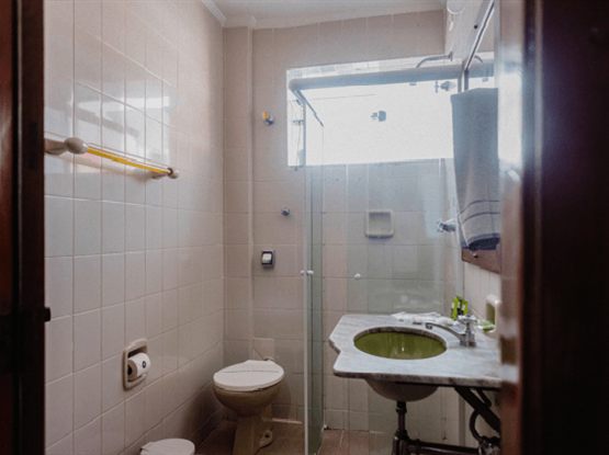 Apartamento quíntuplo familiar, modelo Standard, com 30 metros quadrados. O apartamento é dividido em dois ambientes: o primeiro, separado por uma porta, possui o quarto do casal; o segundo, também com porta, contém o quarto com três camas de solteiro. No hall de entrada, há um guarda-roupa, e o banheiro é compartilhado por toda a família. Ambos os quartos possuem ar-condicionado modelo de janela,...