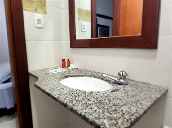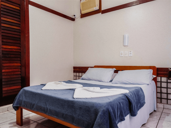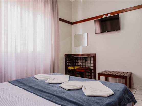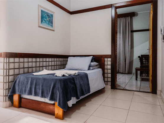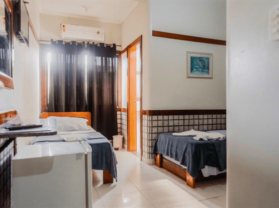 Apartamento Quádruplo familiar, modelo Standard, com 25 metros quadrados. O apartamento é dividido em dois ambientes: o primeiro, separado por uma porta, possui o quarto com 2 camas de solteiro; o segundo, também com porta, contém o quarto com uma cama de casal. O banheiro é compartilhado por toda a família. Ambos os quartos possuem ar-condicionado modelo de janela, TV digital, ventilador e frigobar. Uma ótima opção para famílias