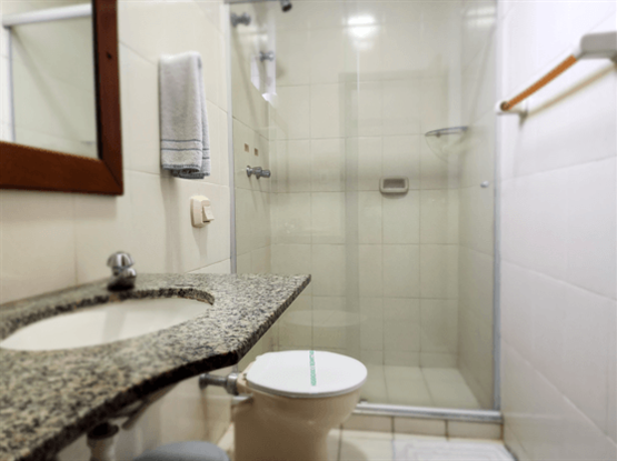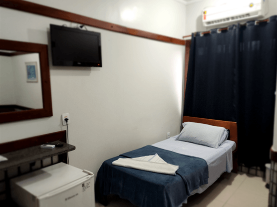 Apartamento Quádruplo familiar, modelo Standard, com 25 metros quadrados. O apartamento é dividido em dois ambientes: o primeiro, separado por uma porta, possui o quarto com 2 camas de solteiro; o segundo, também com porta, contém o quarto com uma cama de casal. O banheiro é compartilhado por toda a família. Ambos os quartos possuem ar-condicionado modelo de janela, TV digital, ventilador e frigob...