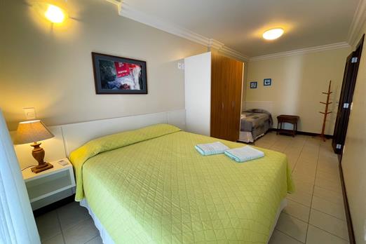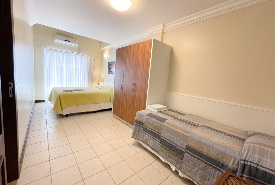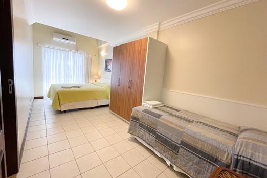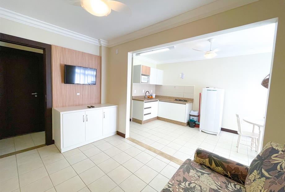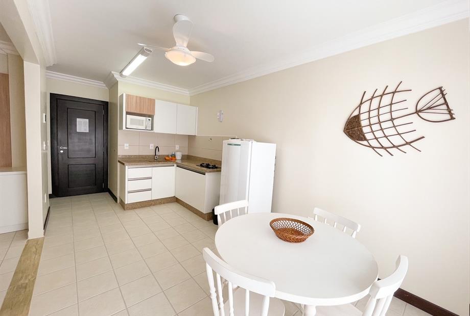 O apartamento 103 dispõe de 01 dormitório. Acomoda até 04 pessoas (01 cama de casal + 01 cama de solteiro + 01 bi-cama na sala). Possui cozinha completa com eletrodomésticos, fogão de mesa, chuveiro elétrico, ar-condicionado e ventilador de teto (não possui forno, churrasqueira individual e lavanderia).