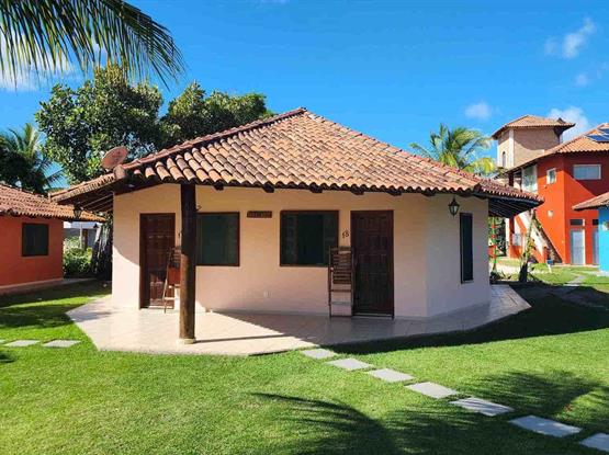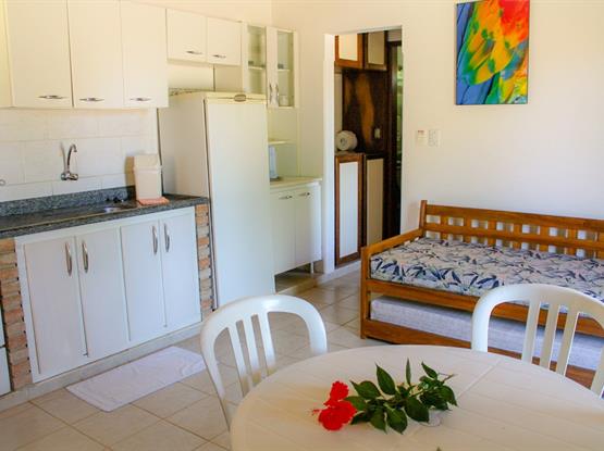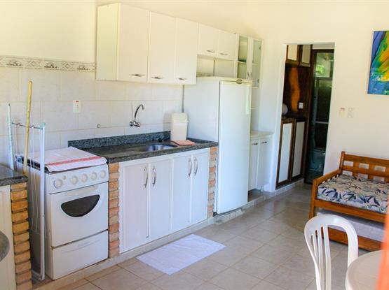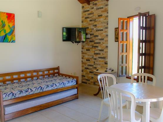 Sala com TV LED 32” FullHD com pacote básico SKY (consulte opções de outros pacotes) e 02 sofás camas, ventilador de teto, com cozinha conjugada equipada com fogão de 4 bocas, geladeira de 01 porta e utensílios (panelas, talheres, pratos e equipamentos para churrasco) 01 banheiro com box, 01 quarto com cama casal e 01 cama de solteiro, cômoda e ar condicionado. Varanda com jogo de mesa e rede. Acomoda até 5 pessoas.