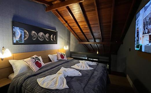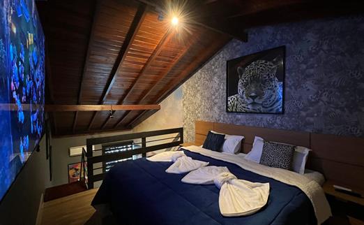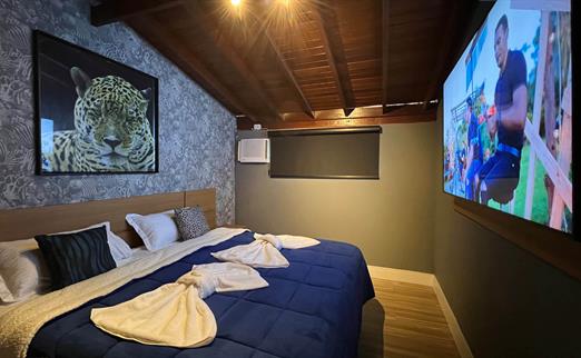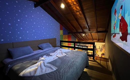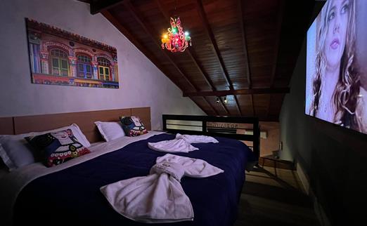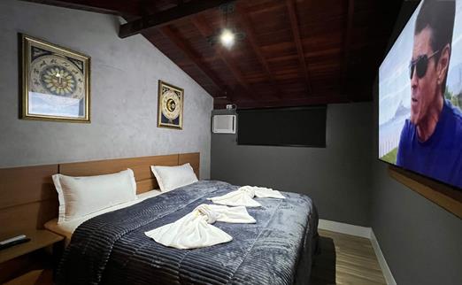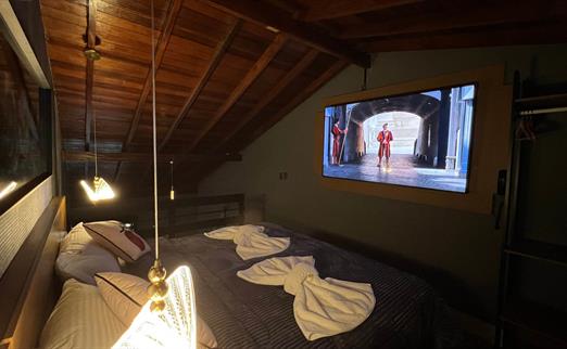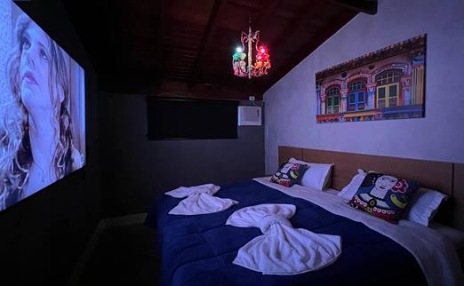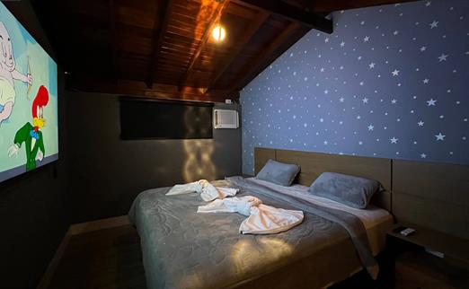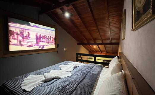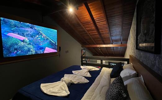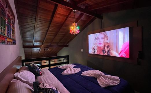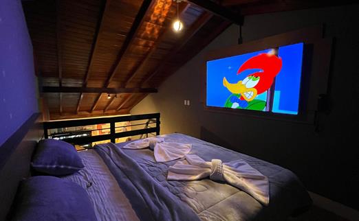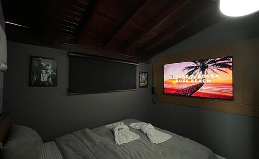 Sala proficional de cinema à disposição do hóspede. Capacidade de até 12 pessoas, com um playstation 5
