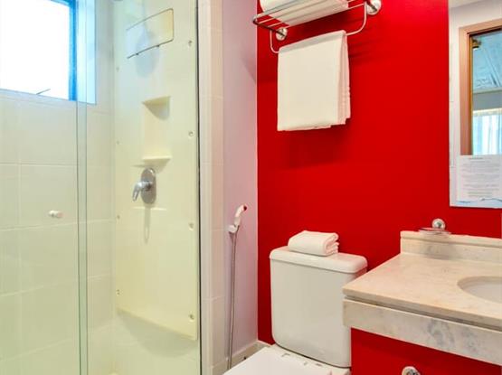O banheiro oferece chuveiro relaxante, produtos de banho de cortesia e secador de cabelo. Como diferencial sustentável, o apartamento também conta com programa de reciclagem no quarto.