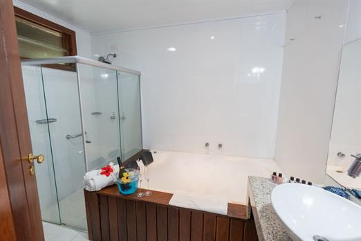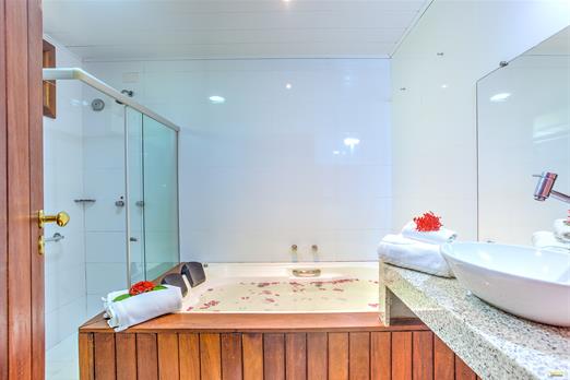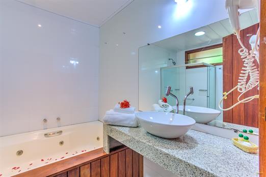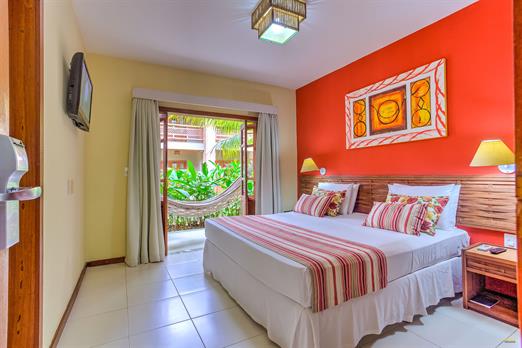 A suíte conta com uma cama king-size extremamente confortável, roupões de banho, ar-condicionado split, frigobar, Smart TV, wi-fi gratuito, cofre digital, secador de cabelo e uma varanda privativa com rede, perfeita para descansar ao som da natureza.