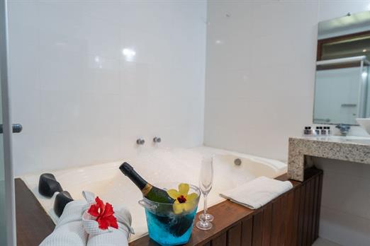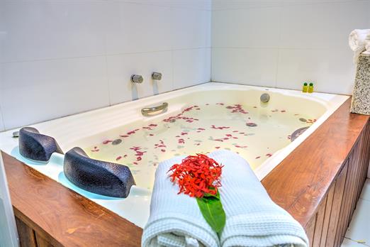 Com 40m² de puro conforto e charme, a Suíte Máster foi pensada para quem deseja viver momentos únicos em um ambiente acolhedor e sofisticado. Sua banheira de hidromassagem privativa é um convite ao relaxamento, enquanto a decoração tropical e os móveis em madeira rústica criam uma atmosfera autêntica e elegante.