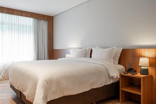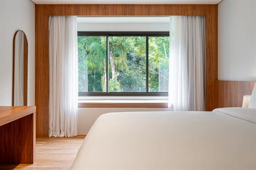 Nossas confortáveis suítes com vista possuem 31m² que abrigam uma sintonia perfeita entre sua arquitetura contemporânea e a natureza. A estádia nessa suíte contempla um contato íntimo com nossos jardins através de suas enormes janelas de vidro com vista panorâmica. Desfrute ainda de uma boa leitura, um bom vinho, café ou chá acomodado em um confortável sofá com futon abaixo da janela de vidro, pensado exclusivamente para que você tenha momentos inesquecíveis.