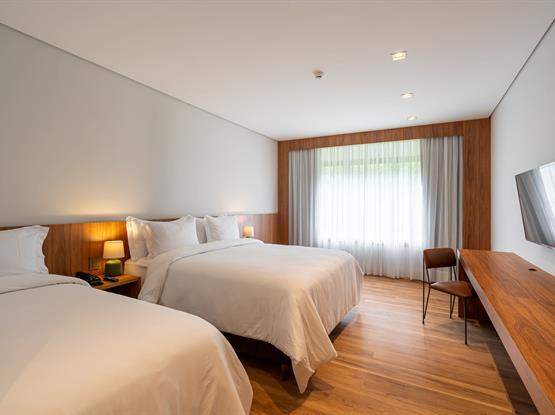 Nossas confortáveis suítes quádruplas com vista possuem 31m², ideal para quem busca uma acomodação mais ampla ou até mesmo para quem viaja em família.