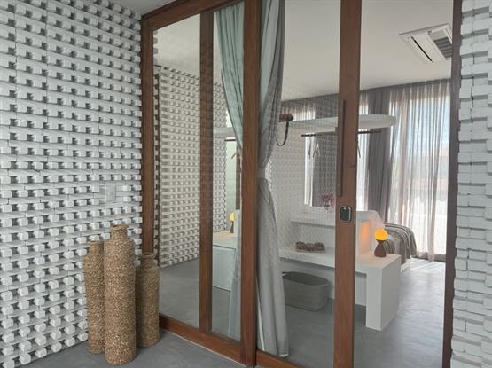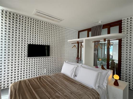 A suíte conta com uma Smart TV de 43 polegadas, proporcionando acesso a uma variedade de canais a cabo e opções de streaming, para que você possa se entreter com facilidade. Além disso, dispõe de frigobar para maior conforto. A decoração dessa suíte tem predominância da madeira do tipo Garapeira.