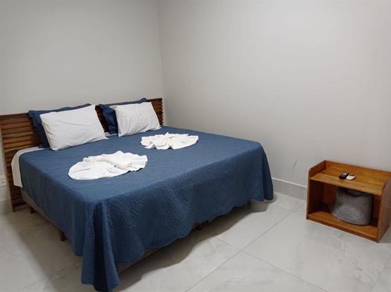 Ao entrar, você será recebido por um espaço cuidadosamente projetado, decorado com tons suaves e aconchegantes, criando uma sensação de calma desde o primeiro momento. A espaçosa cama de casal é o ponto focal, oferecendo um descanso tranquilo após um dia repleto de aventuras.