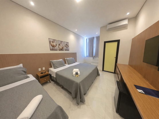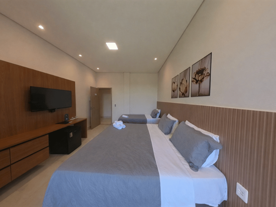 A Suíte Master Piscina do Hotel Recanto Azul foi pensada para proporcionar mais espaço, conforto e exclusividade durante a sua hospedagem. Ampla, moderna e aconchegante, acomoda confortavelmente famílias ou pequenos grupos, contando com duas camas de casal e uma cama de solteiro, todas com enxoval completo e acabamento de alto padrão. A decoração em tons neutros e a iluminação planejada criam um ambiente sofisticado e acolhedor, ideal para momentos de descanso.