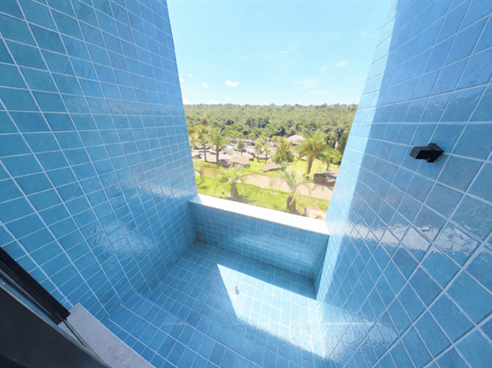 O grande diferencial da Suíte Master Piscina é a piscina privativa integrada ao ambiente, revestida em pastilhas azuis e com vista para a área verde do hotel. Um espaço reservado que proporciona mais liberdade e privacidade, permitindo que você aproveite momentos únicos sem sair da sua suíte. Aqui, você vive a experiência da Praia em Minas com ainda mais conforto e exclusividade.