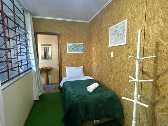Nosso confortável quarto de solteiro, ideal para uma estadia relaxante e conveniente. Este quarto dispõe de uma confortável cama de solteiro, um banheiro privativo para sua privacidade e comodidade, uma mesa de apoio para trabalho ou refeições, além de um pequeno armário para guardar seus pertences. Nosso espaço oferece também áreas comuns, incluindo uma área de jantar para desfrutar de suas refei...