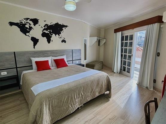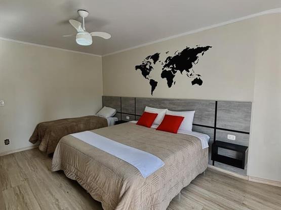 Nosso quarto para até três pessoas, perfeito para uma estadia confortável e relaxante. Este quarto espaçoso dispõe de uma confortável cama de casal e uma cama de solteiro, garantindo uma noite tranquila de sono para todos os hóspedes. Além disso, o quarto está equipado com uma televisão para o seu entretenimento, uma mesa de apoio para maior comodidade e conveniência, e possui um banheiro privativ...