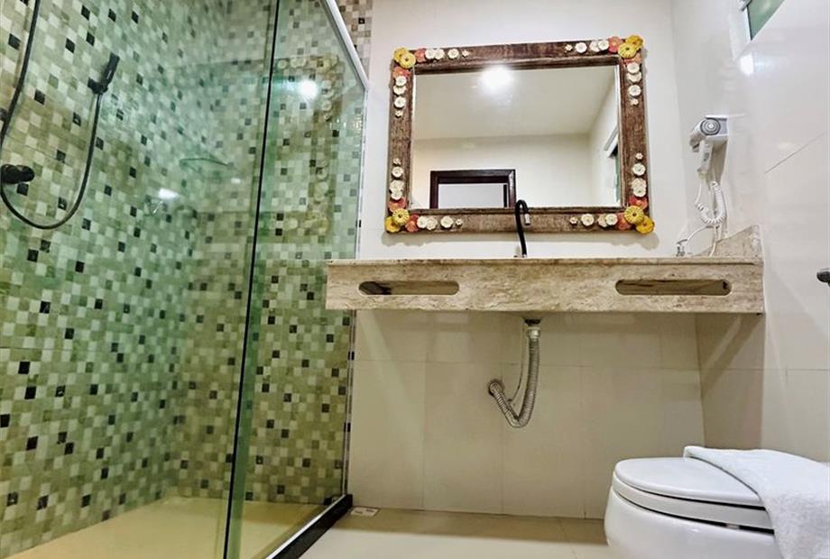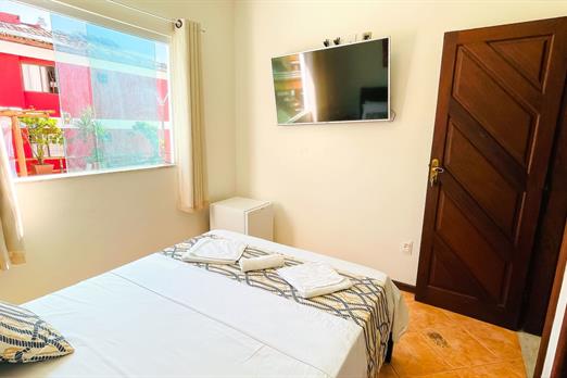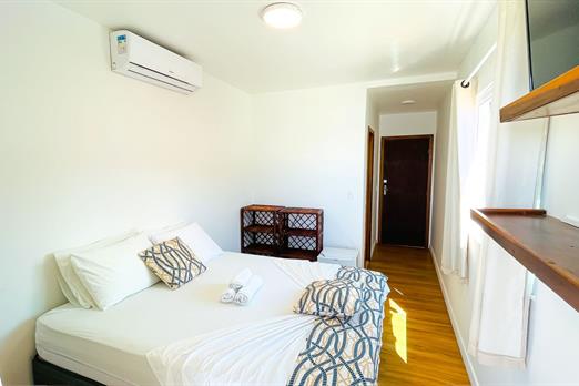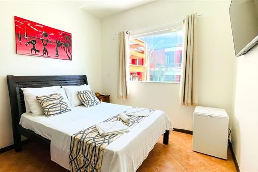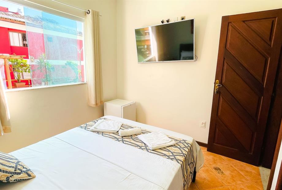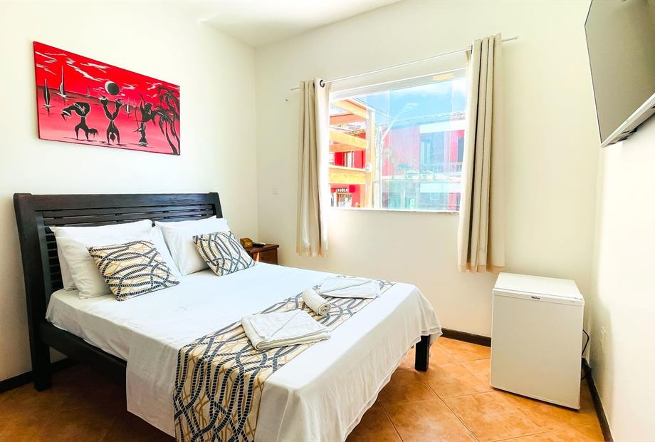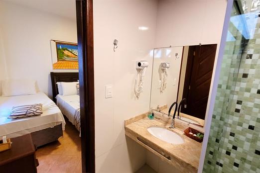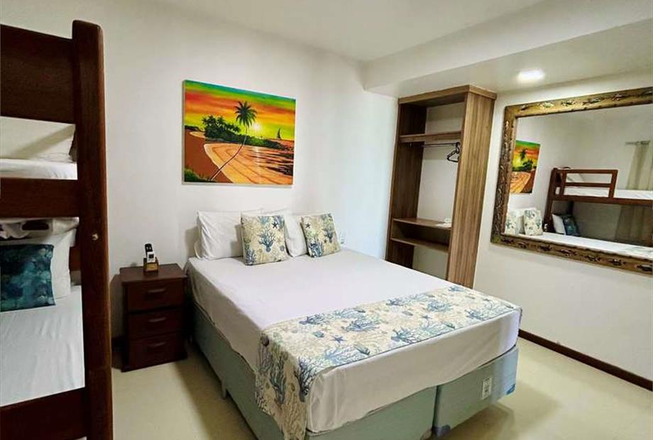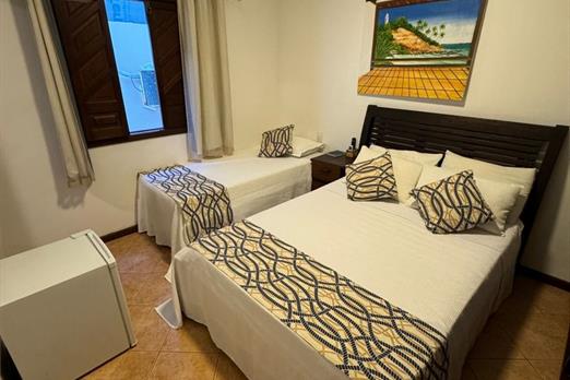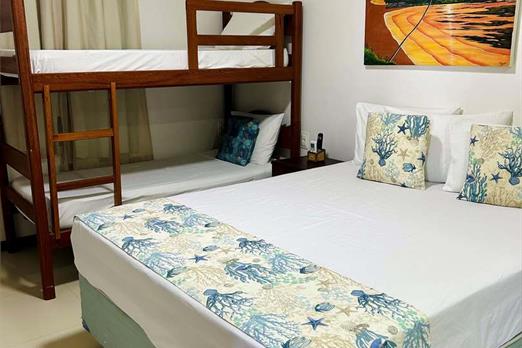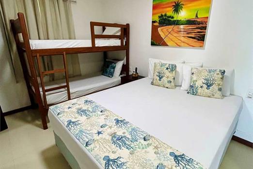 Quarto quadruplo standard em Morro de São Paulo, com uma cama queen e uma beliche de solteiro, ideal para famílias ou grupos. O ambiente é e...