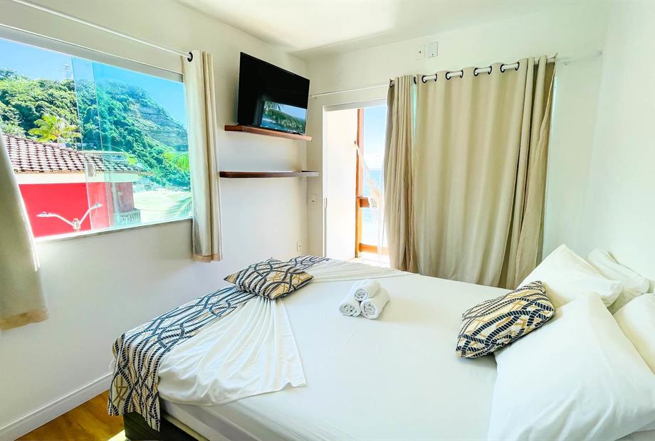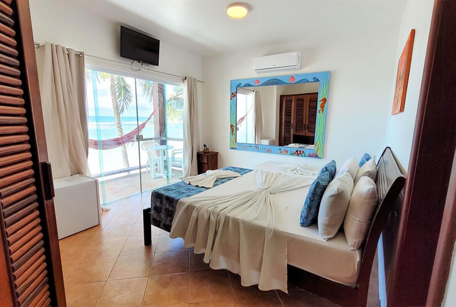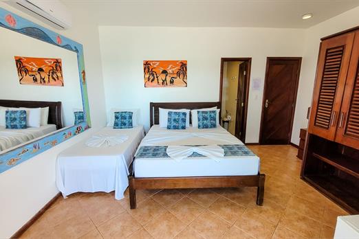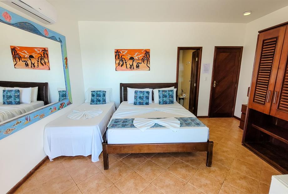 Quarto triplo de frente para o mar em Morro de São Paulo, com uma cama queen e uma cama de solteiro. Equipado com TV, ar condicionado e seca...