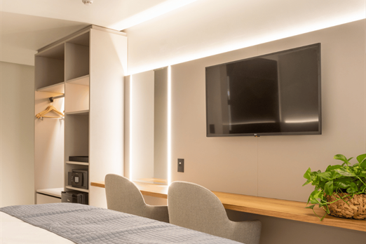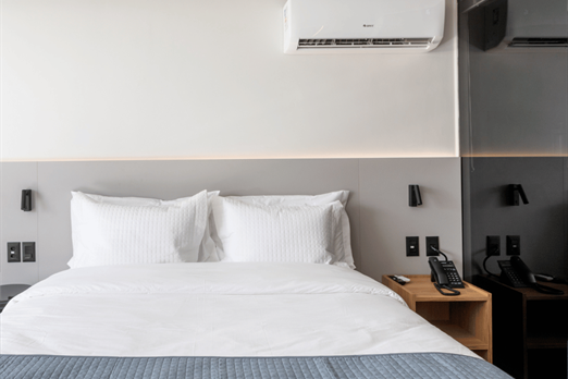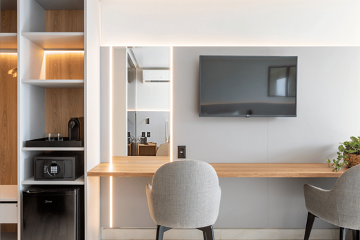 Apto contém Cafeteira, Ar-condicionado, Frigobar, Smart TV, Secador de Cabelo, Wi-fi gratuito, Cofre entre outros itens para sua melhor estada em João Pessoa-PB.