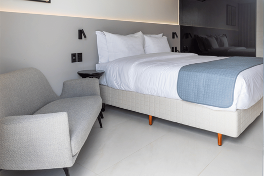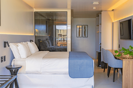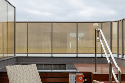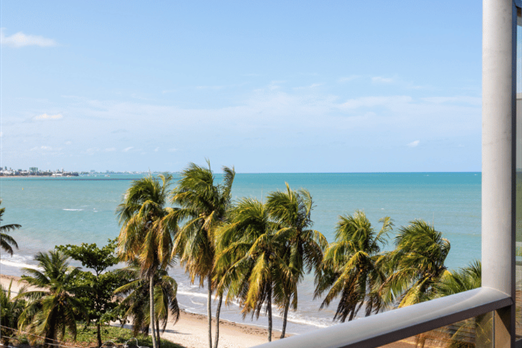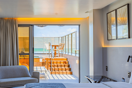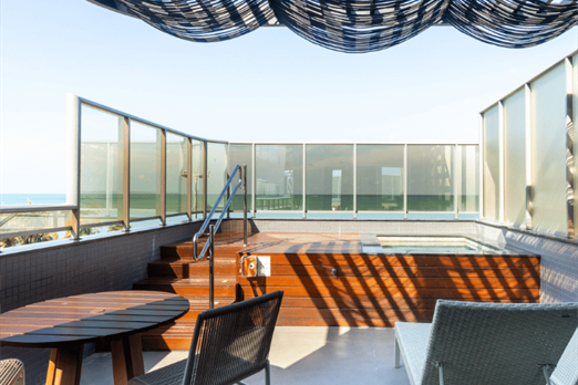 Suítes Icônicas, frente-mar, amplas, confortáveis e modernas, com super Terraço, com mesa, 02 cadeiras, espreguiçadeira e Banheira de hidromassagem privativas, com cerca de 48mt², muito bem decoradas. Definição de exclusividade, sofisticação e bem estar. Localizadas no 4º andar do Hotel.