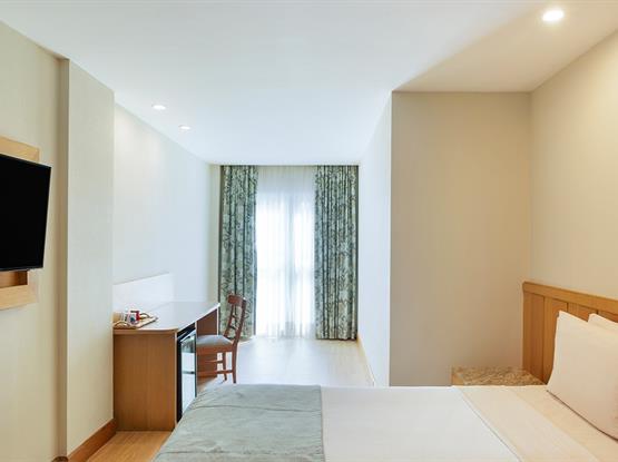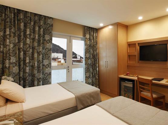 Apartamento espaçoso com varanda, tendo como vista o bairro de Copacabana. O ambiente, que comporta até 2 pessoas, oferece 2 camas de solteiro , TV a cabo, frigobar, cofre eletrônico e ar condicionado que se desconecta automaticamente quando a janela antirruído é aberta. O local também é ideal para trabalhar, já que possui acesso à internet e bancada de trabalho. O banheiro privativo oferece chuveiro, secador de cabelo , espelho de maquiagem e kit de amenities