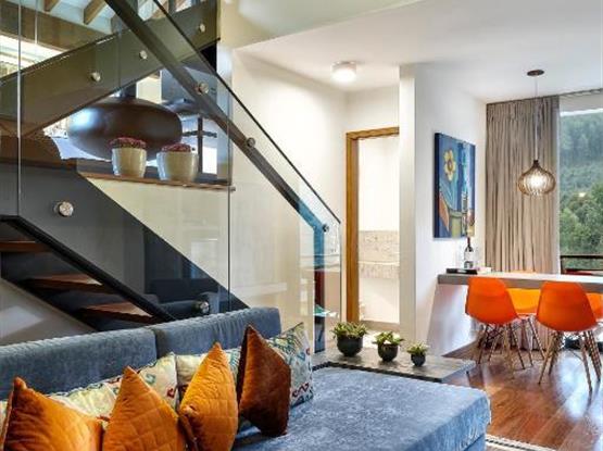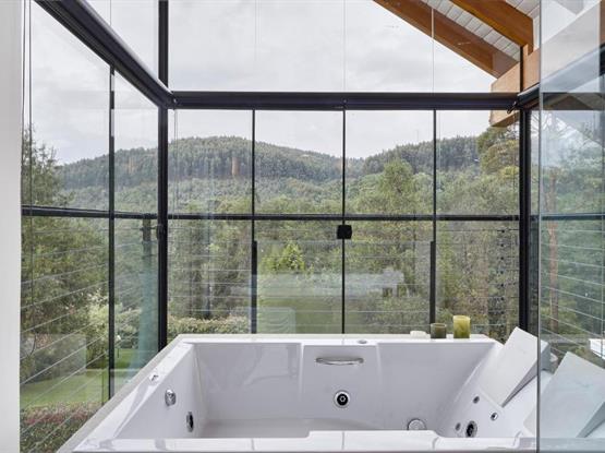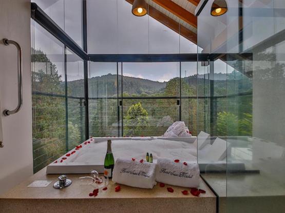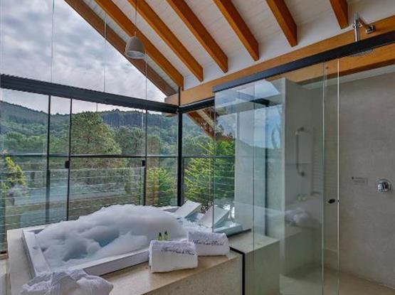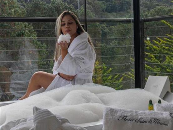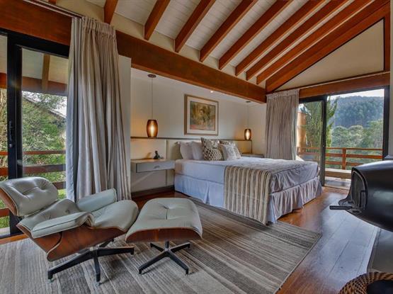 Este chalé possui três pavimentos, sala de estar e refeições, dormitório e sala de banho com banheira de hidromassagem suspensa e com vista para as montanhas, três varandas, duas lareiras, sendo uma no dormitório e outra ecológica na sala, lençol 400 fios, frigobar, roupa de banho em algodão egípcio, máquina de café Nespresso, duas TVs Smart s, calefação independente, kit Amenities L’Occitane e e...