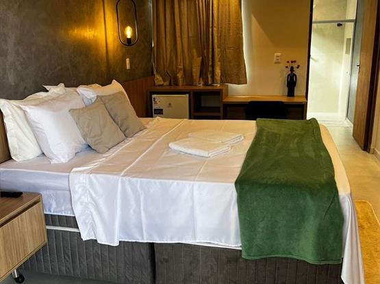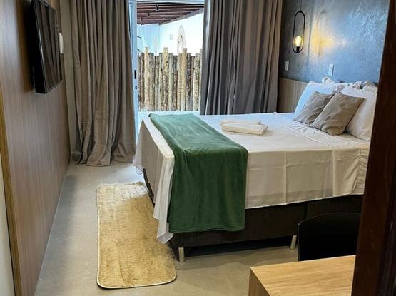 Com uma decoração moderna que harmoniza toques rústicos e aconchegantes, o Quarto Deluxe Duplo é ideal para casais que buscam conforto e tranquilidade. Com 23m².