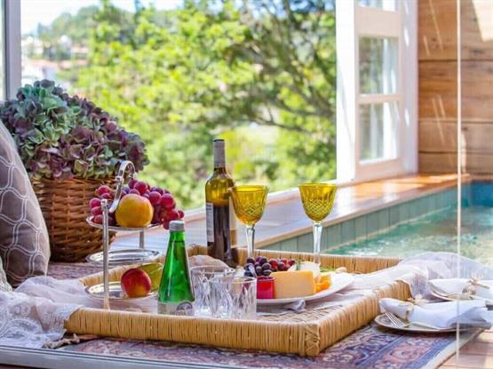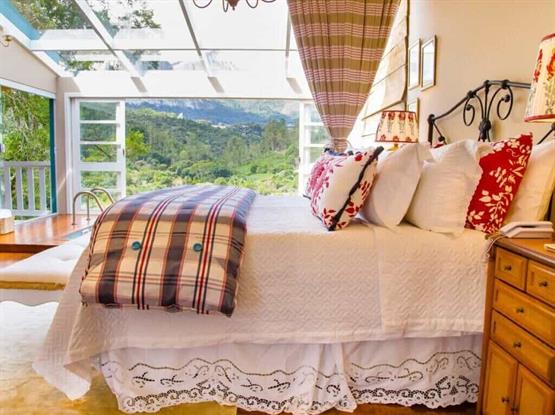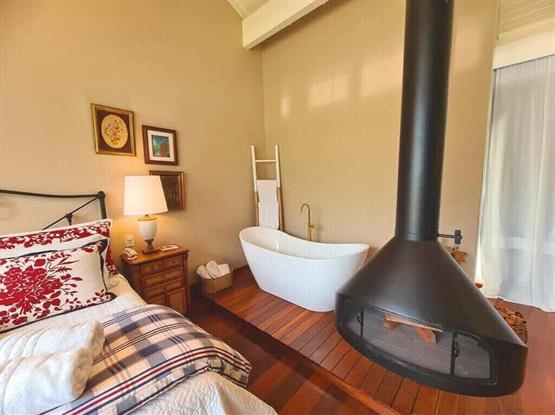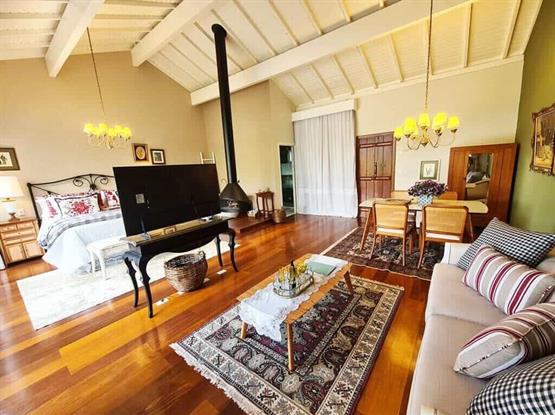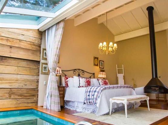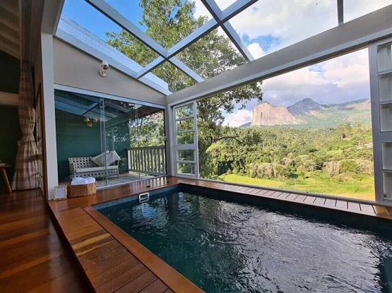 Suíte térrea, banheira de imersão, janelão de 6 metros com vista para a Pedra Azul, varanda, lareira a lenha e cama “Super King”. Piscina com teto de vidro e climatizada de acordo com normativa DIVISA/SVS Nº 7 de 02/06/2017 que regulamenta a temperatura da piscina de água aquecida a ser mantida entre 23ºC e 30ºC. Possui wifi, adega climatizada, chaleira elétrica, aparelho SMARTV e ar condicionado Fujitsu. Edredom de plumas de ganso, lençóis de algodão egípcio, peças de enxoval e roupões de banho Trousseau, secador de cabelo, sais de banho, ammenities de marcas variadas incluindo Bulgari, Trousseau e Alexandre Herchcovitch. Frigobar personalizado. Licor de cortesia.