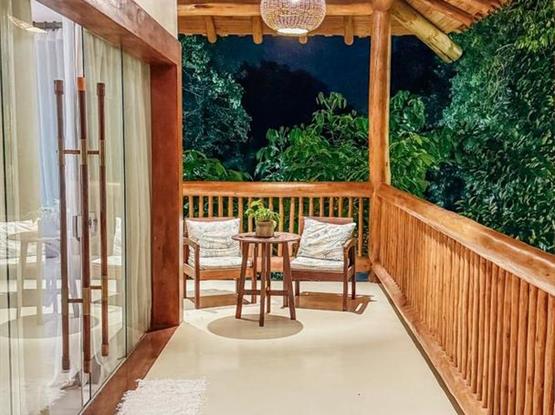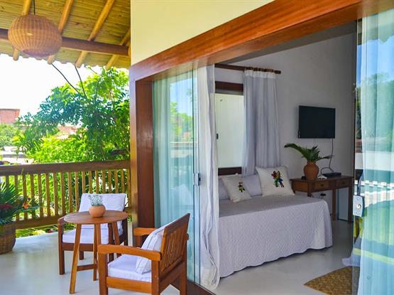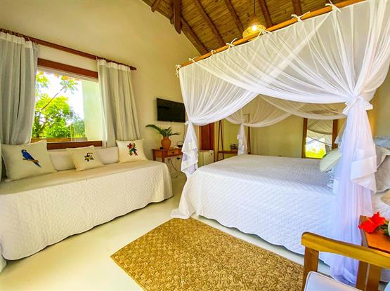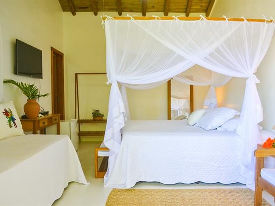 As acomodações incluem uma confortável cama de casal e uma cama de solteiro, perfeitas para até três hóspedes. O grande destaque é a vista privilegiada para a piscina, criando um ambiente relaxante e revigorante, ideal para quem deseja desfrutar de momentos inesquecíveis durante a estadia.