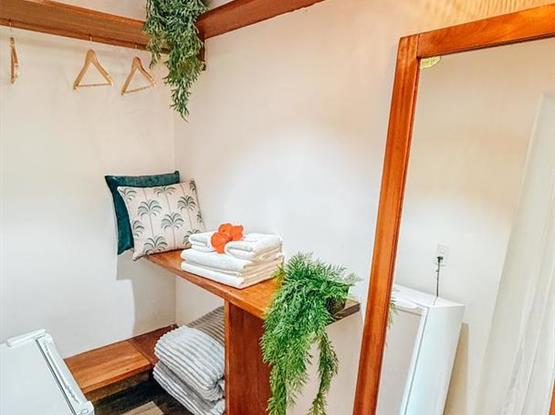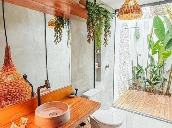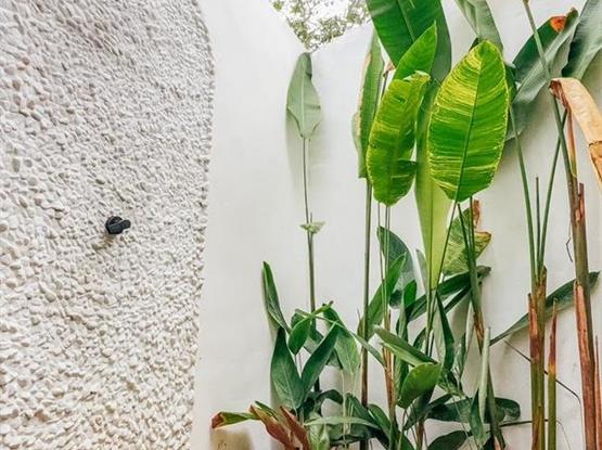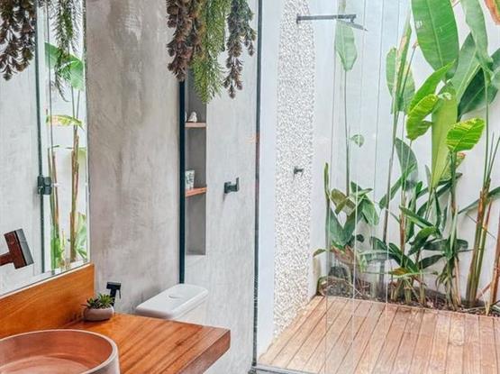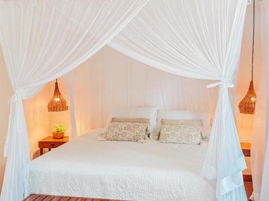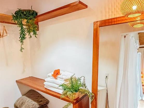 Esta charmosa suíte oferece todo o conforto necessário para uma estadia inesquecível. Elegante e bem equipada, conta com ar-condicionado para garantir um clima agradável, um espaçoso closet para organizar seus pertences, frigobar para suas bebidas e snacks, e um chuveiro externo perfeito para um banho refrescante ao ar livre.