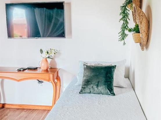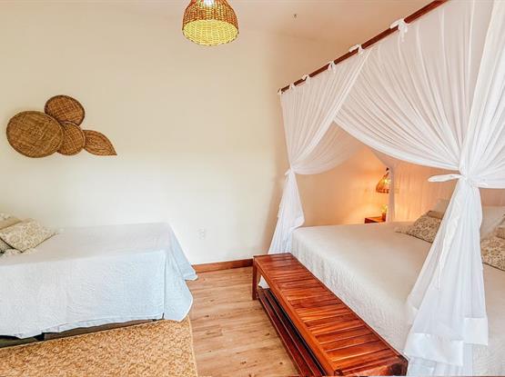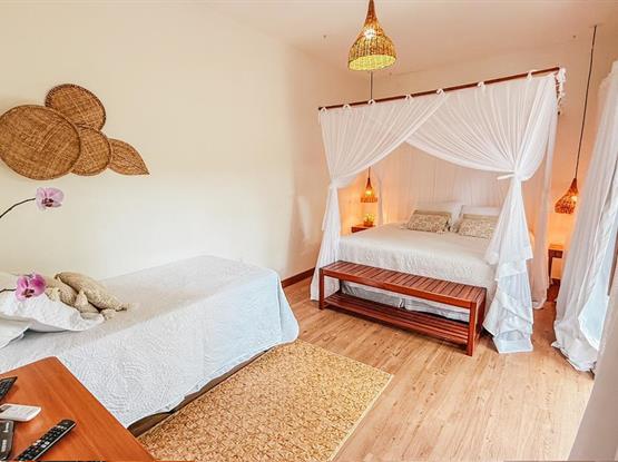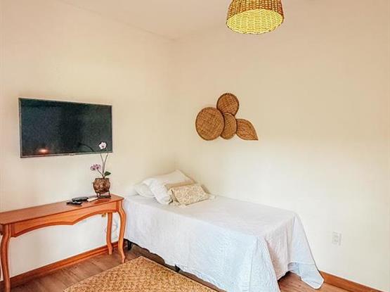 Além disso, a suíte dispõe de uma Smart TV para momentos de entretenimento, uma confortável cama de casal e uma cama de solteiro, ideal para acomodar até três pessoas com praticidade e aconchego. É o espaço perfeito para relaxar e aproveitar o melhor da sua viagem!
