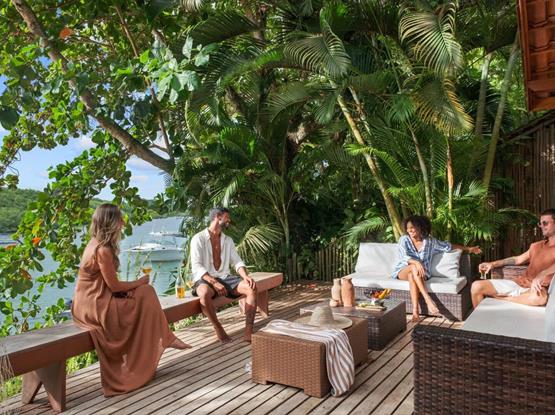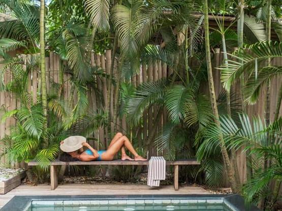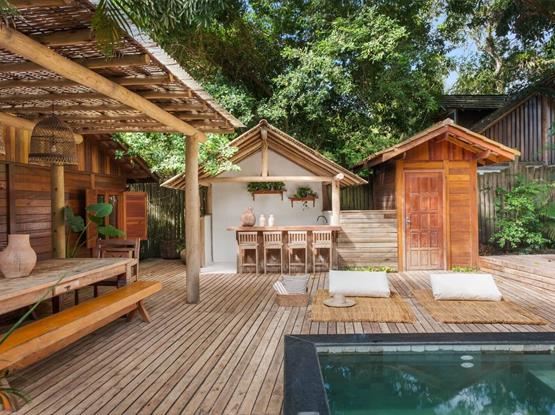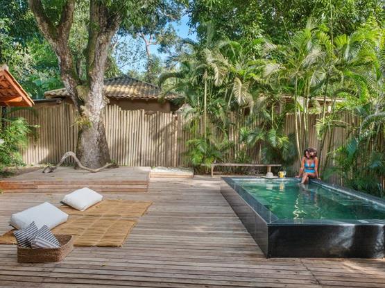 Os hóspedes da Cabana também podem usufruir da área externa compartilhada da pousada, com piscina e deck em meio às árvores, integrada à natureza.