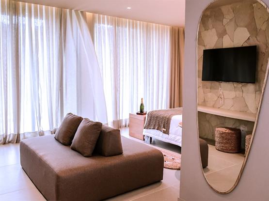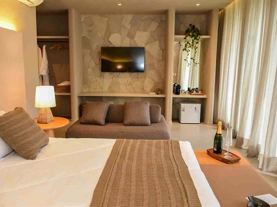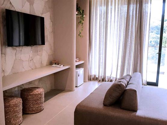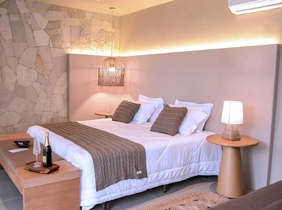 Ampla suíte com 54m² de puro conforto composta 1 quarto e 1 sala de banho com chuveiro duplo com ampla área de chuveiro e bancadas duplas. Suíte disponíveL no 2º andar. A acomodação possui decoração sofisticada e conta com ar-condicionado, TV de tela plana com serviços de streaming, paredes com isolamento acústico, frigobar, cofre e varanda privativa. A unidade inclui 1 cama king e 1 sofá-cama. Acomoda até 4 pessoas mediante solicitação de cama extra.