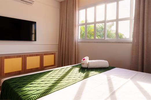 Com dois quartos e dois banheiros, o Apartamento Family é perfeito para quem busca mais espaço e comodidade. Localizado no térreo, com vista para a piscina, acomoda até seis pessoas em duas camas de casal queen-size (não separáveis) e um sofá-cama duplo. A cozinha completa é equipada com frigobar, mesa com três cadeiras, fogão cooktop de uma boca e utensílios de cozinha. O apartamento conta com ar-condicionado em cada ambiente, TVs, banheiros com ducha, secador de cabelo, kit de amenities (sabonete e shampoo) e enxoval completo.