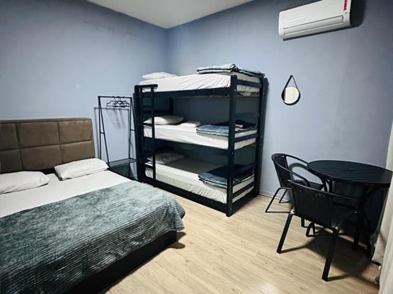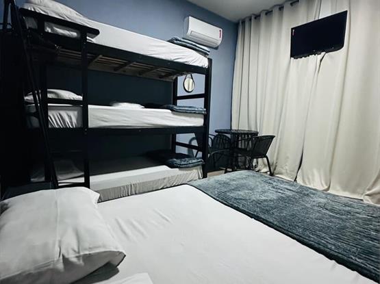 O Quarto Estúdio é perfeito para famílias ou grupos de até 5 pessoas. Ele conta com cama de casal, cama triliche, TV e ar-condicionado, garantindo uma estadia aconchegante.
