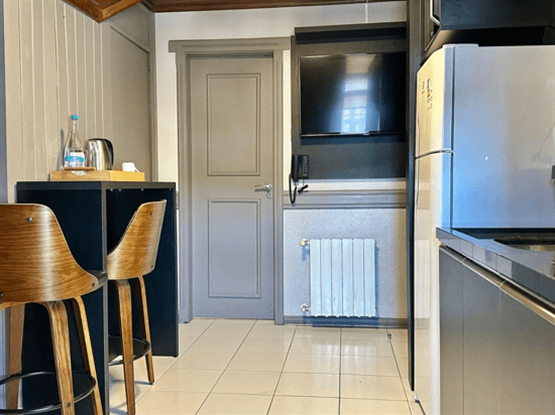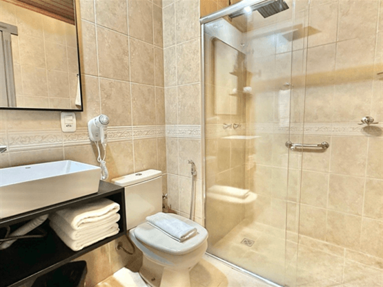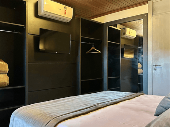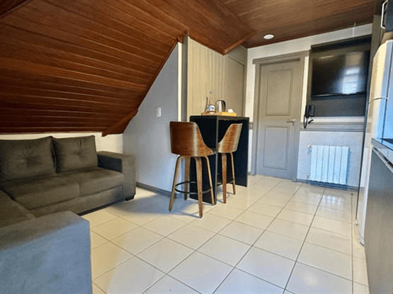 A Suíte Luxo Duplo é uma acomodação aconchegante e funcional que recebe até duas pessoas com todo o conforto necessário para uma estadia memorável. O espaço conta com cama queen size, Smart TV, frigobar, calefação e ar-condicionado, além de um quarto acolhedor integrado a uma sala com cozinha completa, ideal para preparar refeições com praticidade e aproveitar momentos de convivência. O banheiro privativo dispõe de chuveiro, secador de cabelo e um kit completo de amenities, garantindo ainda mais comodidade. Esta categoria é acessada por escada.
