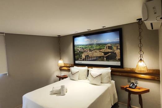 A Suíte Villa Gradara é um convite ao descanso com sofisticação. Seu design une o charme rústico da madeira com toques modernos e uma atmosfera aconchegante. O quarto oferece cama king size com enxoval premium, iluminação suave e varanda com vista privilegiada da natureza ao redor.